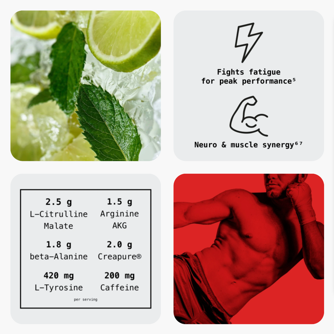 Malate de L-Citrulline, Mélange de vitamines et minéraux (Citrate de Potassium, Carbonate de Calcium, Citrate de Sodium, Oxyde de Magnésium, Acide L-Ascorbique, Nicotinamide, Cholécalciférol, Chlorhydrate de Pyridoxine, Cyanocobalamine, Acide Ptéroylmonoglutamique), Créatine Monohydratée, Bêta-Alanine, L-Arginine Alpha-Cétoglutarate, Antiagglomérant (Phosphates de Calcium), Acidifiants (Acide Citrique, Acide Malique), Arômes, Chlorhydrate d’Acétyl-L-Carnitine, L-Tyrosine, Caféine Anhydre, Extrait de Feuille de Ginkgo biloba, AstraGin® (Extraits de Racine de Panax notoginseng et d’Astragalus membranaceus), Senactiv™ (Extraits de Racine de Panax notoginseng et de Fruit de Rosa canina), Édulcorants (Sucralose, Acésulfame-K), Extrait de Fruit de Poivre Noir.